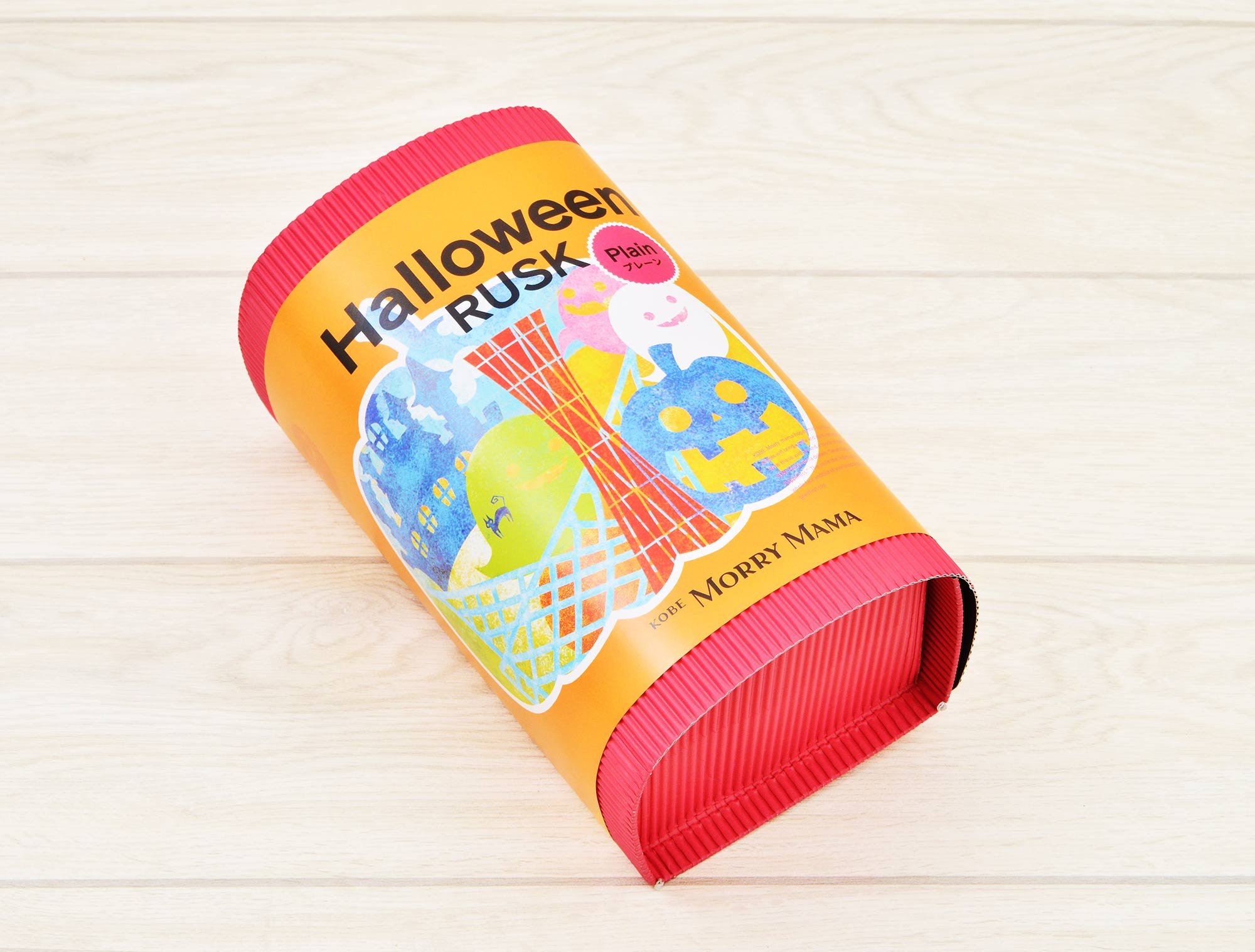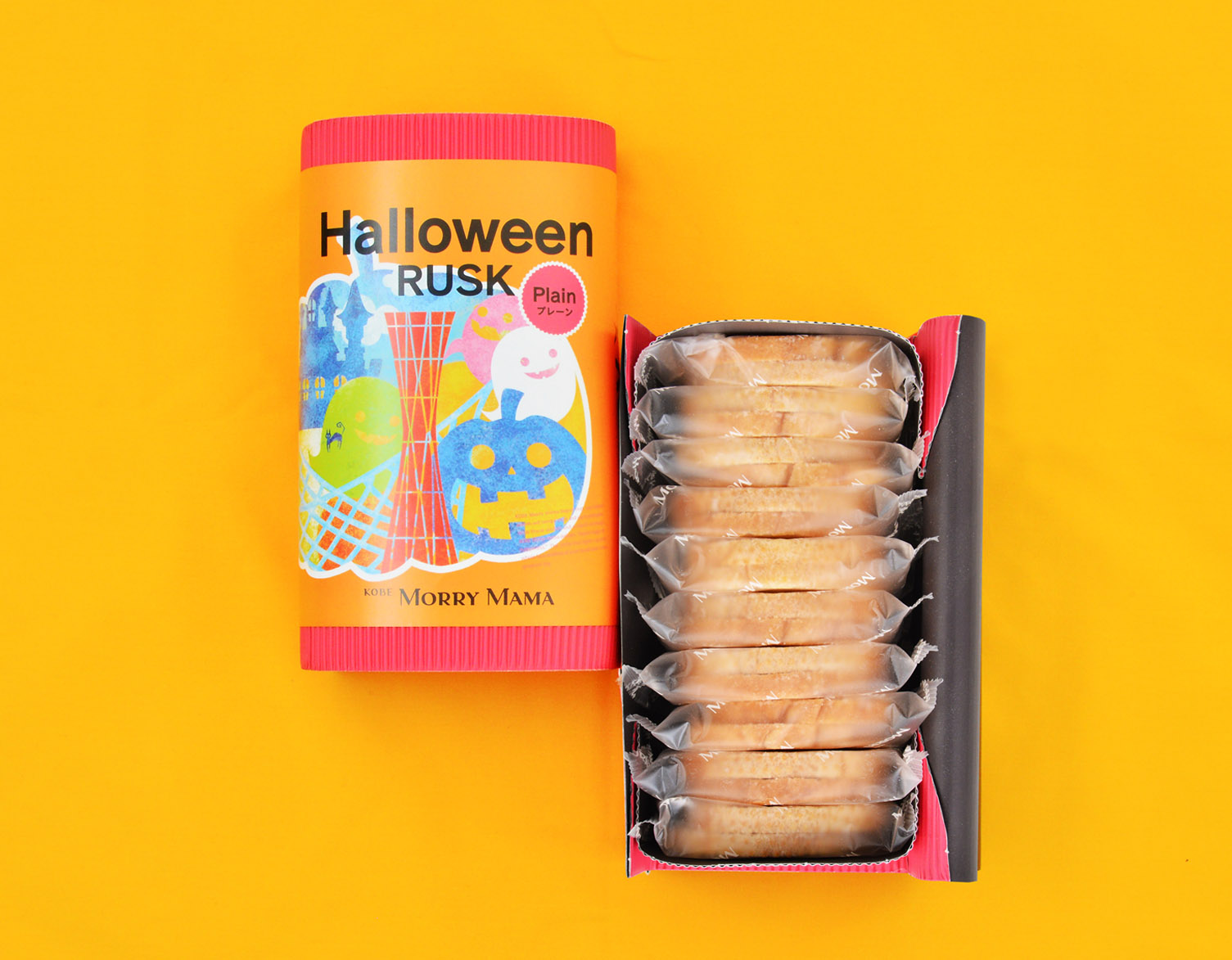ハロウィンデザインのモリーママ人気No,1のプレーンラスクです。かぼちゃに神戸のランドマークやお化けたちを詰め込んだ、にぎやかで可愛いパッケージをご用意いたしました。ハロウィンパーティーの手土産など、ギフトにおすすめです。